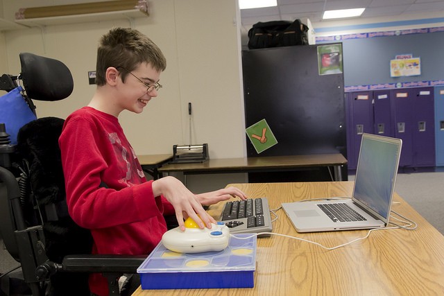 Robuuste trackball voor kinderen, met aansluitmogelijkheid voor twee losse schakelaars.