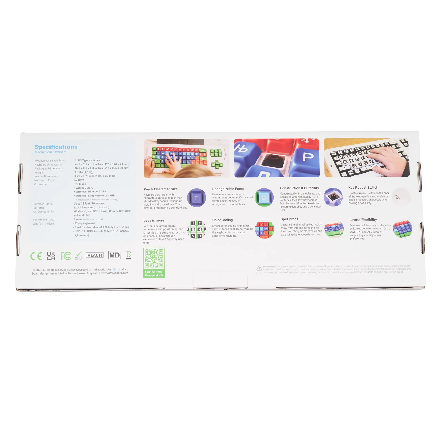 De belangrijkste vernieuwing van deze versie is de TRI-mode connectiviteit. Het toetsenbord kan bedraad worden gebruikt via USB-C, maar ook draadloos via Bluetooth. Hierdoor kan eenvoudig worden geschakeld tussen vaste werkplekken, laptops en tablets zonder het toetsenbord te hoeven vervangen. In zorg- en onderwijsomgevingen waar flexibiliteit essentieel is, maakt dit het mogelijk om één hulpmiddel op meerdere locaties en bij verschillende cliënten te gebruiken.