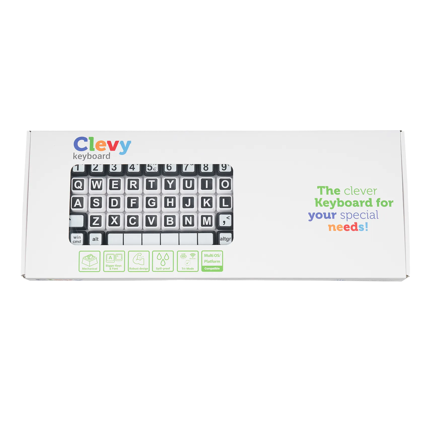 Het Clevy Contrast Toetsenbord in zwart-wit uitvoering is speciaal ontwikkeld voor gebruikers die behoefte hebben aan maximale leesbaarheid, overzicht en controle tijdens computergebruik. Deze vernieuwde TRI-mode versie biedt extra flexibiliteit doordat het toetsenbord op meerdere manieren kan worden verbonden met computers en mobiele apparaten. Hierdoor is het toetsenbord breed inzetbaar binnen zorginstellingen, therapie, logopedie en onderwijs, waar werkplekken en begeleidingsvormen vaak wisselen.