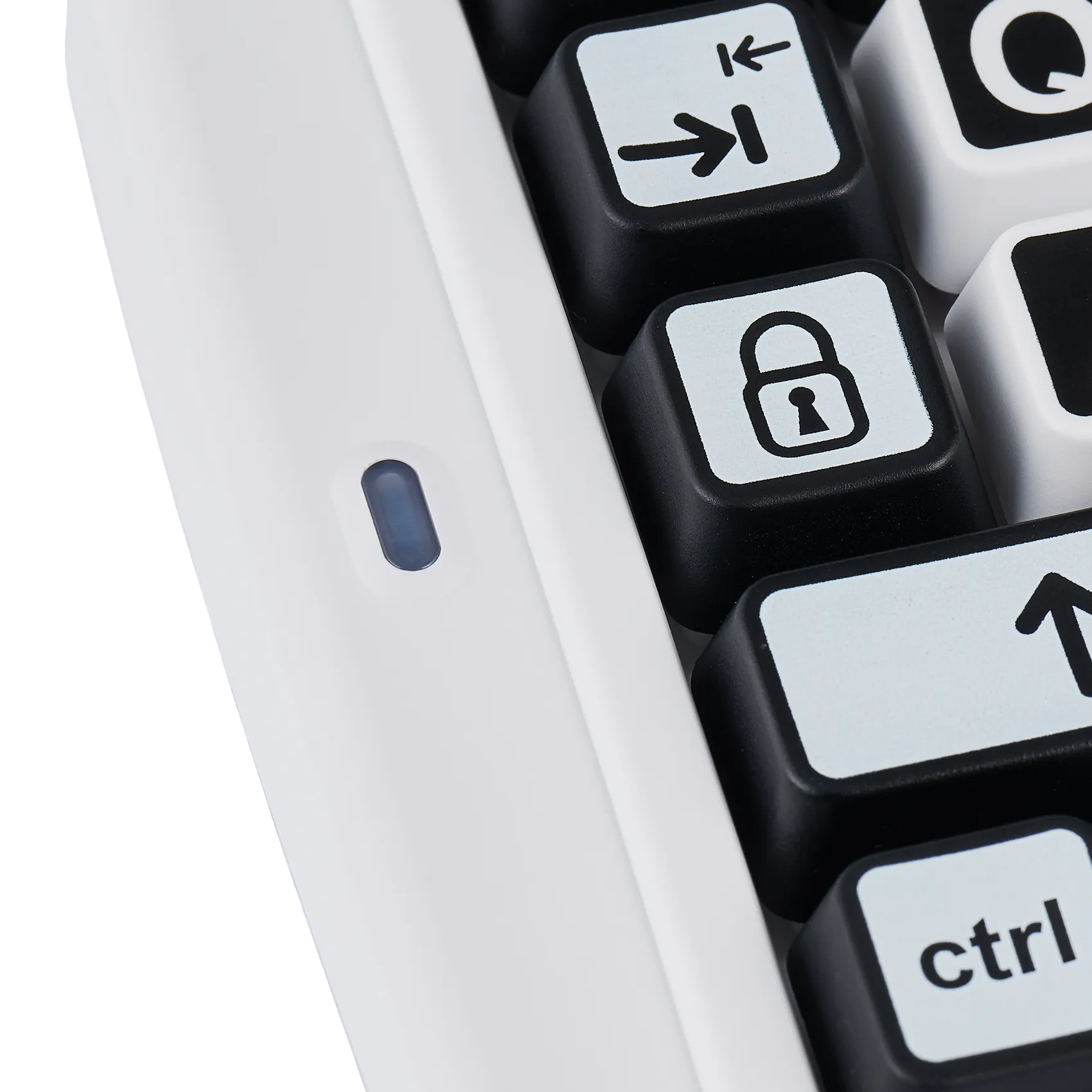 De zwart-witte toetsen zorgen voor een duidelijk visueel onderscheid tussen de verschillende toetsen. De letters en cijfers zijn aanzienlijk groter dan op standaard toetsenborden, wat helpt bij het verminderen van visuele belasting. Dit ondersteunt gebruikers die moeite hebben met kleine tekens, snel vermoeid raken of onzeker zijn tijdens typen.