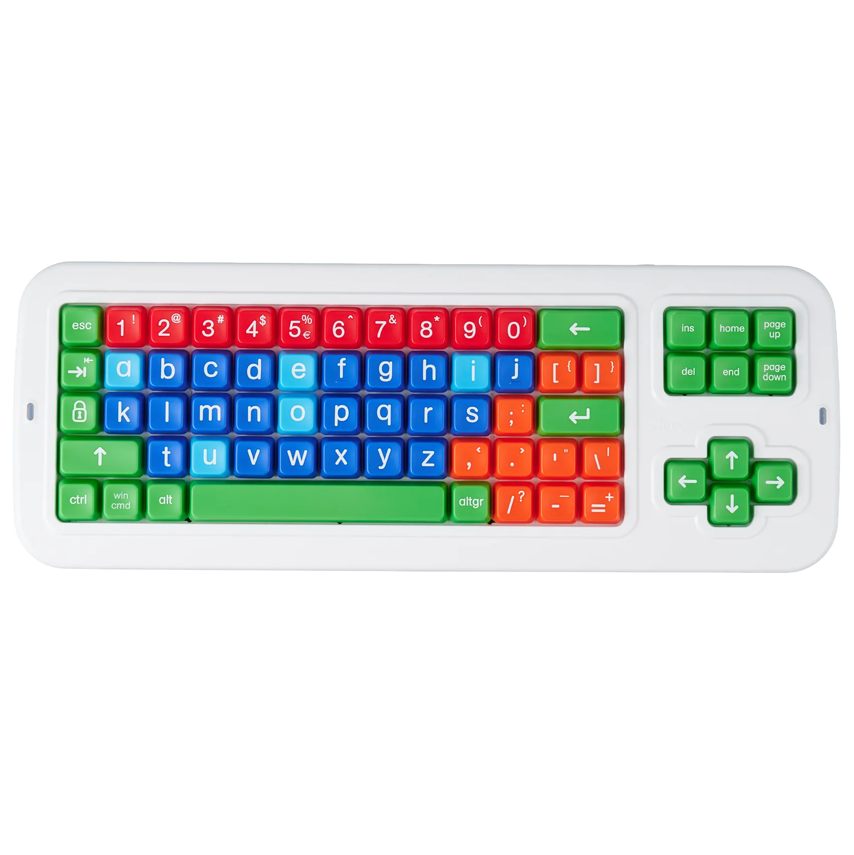 De toetsen zijn extra groot en voorzien van een duidelijk vergroot lettertype en kleine schrijfletters, perfect voor jonge kinderen of slechtzienden. Het kleurgecodeerde ontwerp onderscheidt klinkers, medeklinkers, cijfers en functietoetsen, zodat leren typen overzichtelijk blijft. Dankzij de tactiele feedback en de Key repeat‑schakelaar worden onbedoelde dubbele toetsaanslagen voorkomen, ideaal bij motorische uitdagingen.