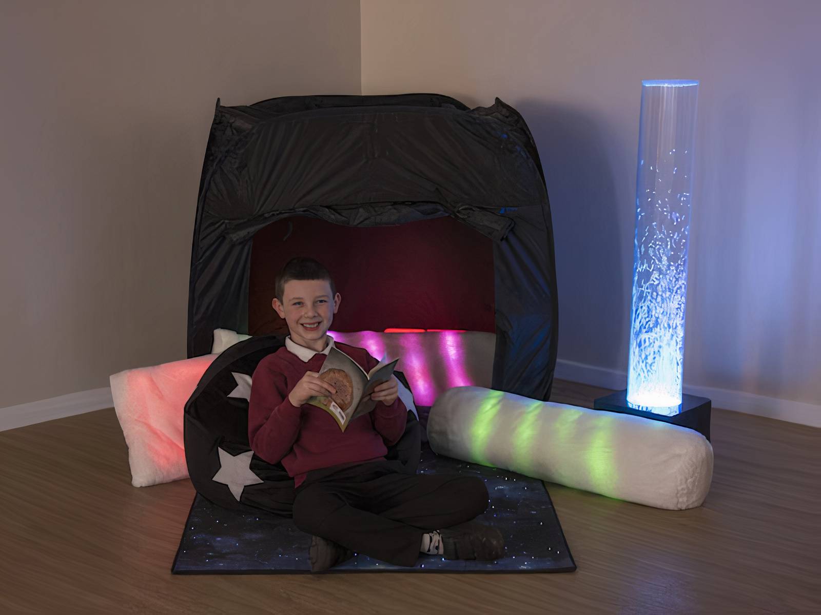 De ingebouwde verlichting produceert een zachte gloed en kan verschillende kleuren tonen. Dit visuele element kan de aandacht richten en een rustgevend effect hebben op het visuele systeem. Kinderen die gevoelig zijn voor overstimulatie kunnen juist gebaat zijn bij een rustige, gelijkmatige lichtbron die helpt om hun aandacht te centreren.