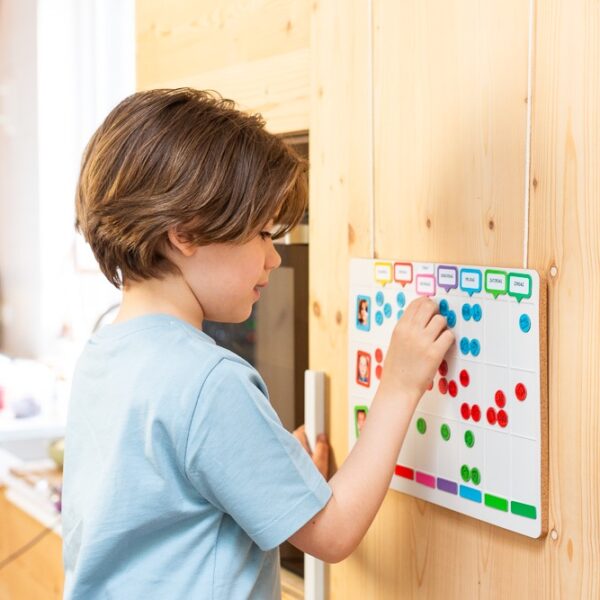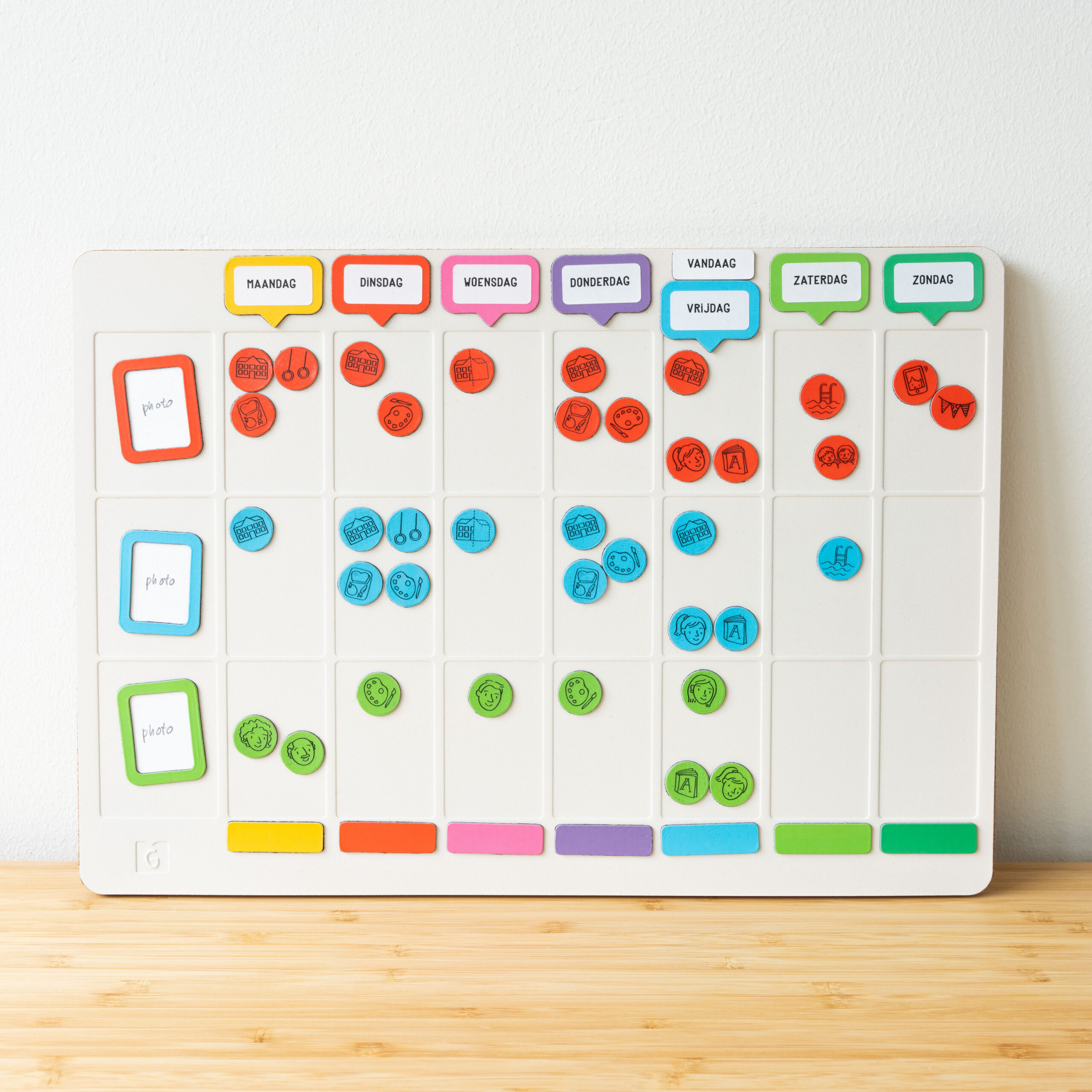 - Met duidelijke pictogrammen en kleurrijke magneetjes zien ze in één oogopslag wat er die dag of week gebeurt.