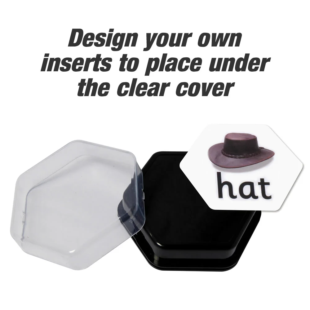 De Zeshoekige praatknop zwart | Talking Tile is een praktische, recordable spraakknop waarmee je gesproken boodschappen, geluiden of muziek kunt opnemen en direct afspelen door erop te drukken. Met een opnamecapaciteit van tot wel ca. 80 seconden per knop kun je langere boodschappen, instructies of verhalen vastleggen, wat deze knop ideaal maakt voor spreek- en luisteractiviteiten, taalontwikkeling en geheugenondersteuning. De zwarte Talking Tile heeft een ingebouwde microfoon en luidspreker, waardoor opnemen en afspelen eenvoudig en toegankelijk is voor kinderen en volwassenen.